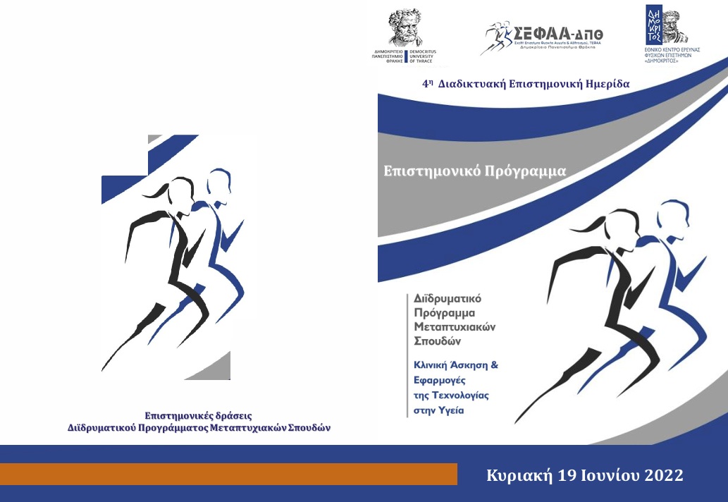 4η Διαδικτυακή Θεματική Ημερίδα του Διϊδρυματικού Προγράμματος Μεταπτυχιακών Σπουδών: «Κλινική Άσκηση και Εφαρμογές της Τεχνολογίας στην Υγεία», που οργάνωσε η Σχολή και το Τμήμα Επιστήμης Φυσικής Αγωγής και Αθλητισμού (Τ.Ε.Φ.Α.Α.) του Δημοκριτείου Πανεπιστημίου Θράκης σε συνεργασία με το Εθνικό Κέντρο Έρευνας Φυσικών Επιστημών «ΔΗΜΟΚΡΙΤΟΣ» – Ινστιτούτο Πληροφορικής και Τηλεπικοινωνιών Πρόγραμμα Ημερίδας ΑΦΙΣΑ Ημερίδας ΠΡΑΚΤΙΚΑ Εργασιών Ημερίδας